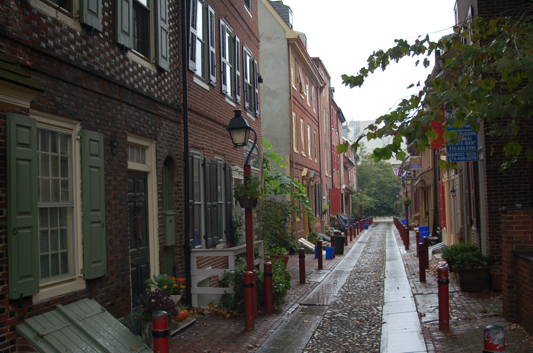 Free from work obligations, we head down 2nd Ave on an overcast, yet warm day, taking a quick walk through Elfreth’s Alley –” the oldest residential street in the US” (watch out Europe, this street dates back to the 1700’s!) It’s a cozy little spot, and has gorgeous, early colonial architecture I love so much, accented with authentic 1700’s indigo recycling bins.