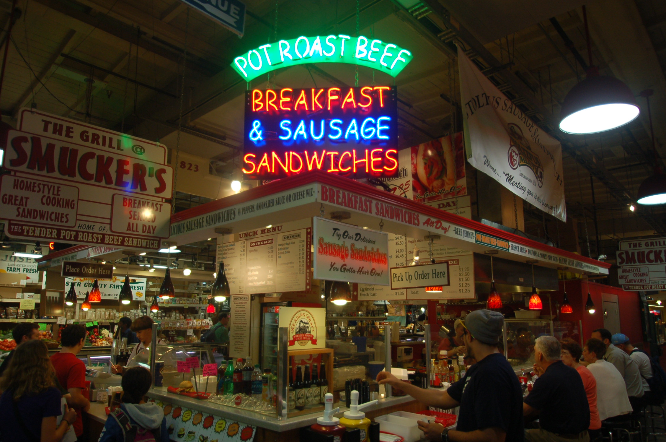 The smell of Amish cooking punches you in the nose, then brisket/cheesesteak, sausages and other artery clogging goodness along with fresh produce in the south quadrant. I grab a banana/strawberry smoothie, saving my arterial constitution, but vow to come back for cheesy goodness.