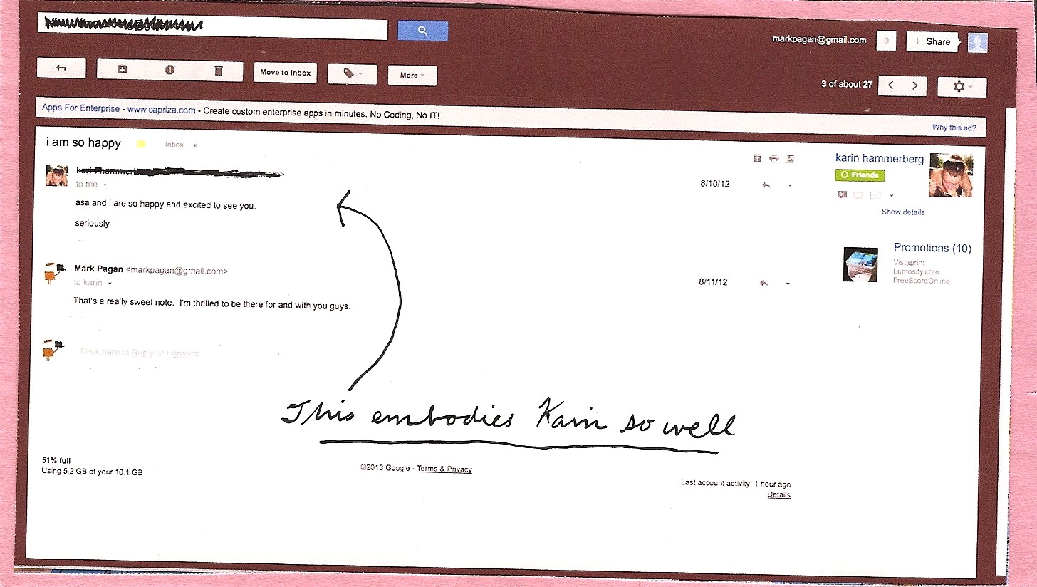 Let me start with Karin. We performed improv together for a few years in DC. She’s a tall, beautiful, comedic friend. She married Asa, a wonderfully quiet-natured guy. They have housed and fed me while listening to many moans about my relationships. I’m envious of how easy they make it all look and I would’ve been upset if I missed the wedding because of my social fears.
