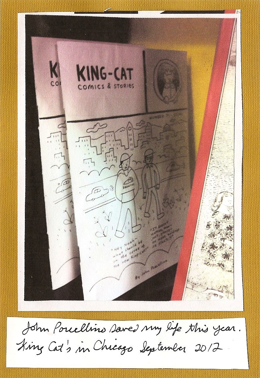 Chicago. I encourage everyone to go to Chicago to experience asking for directions in a major Midwestern city. I am dumbfounded at how approachable the stock of Chicago residents are and it seems if they don’t know the answer to something they know someone named Norm who’s just across the street. “Hey Norm! This fella over here is looking for some good Mexican food. Do you know where he should go?”. I discovered John Porcellino‘s work a few weeks after I quit drinking and it’s kept me feeling less lonely in this world. Chicago has become synonymous with his name and I was thrilled to signs of his presence in Illinois.