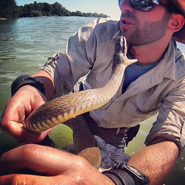 Coyote sneaks over the cement dock and dives headfirst in the retainer rocks, grabbing a massive water snake. A struggle ensues, and at first I think Coyote’s hamming it up for TV, then I realize he’s getting bit, a lot, and is not joking around. He then pulls out this monstrosity that tries to french kiss him: