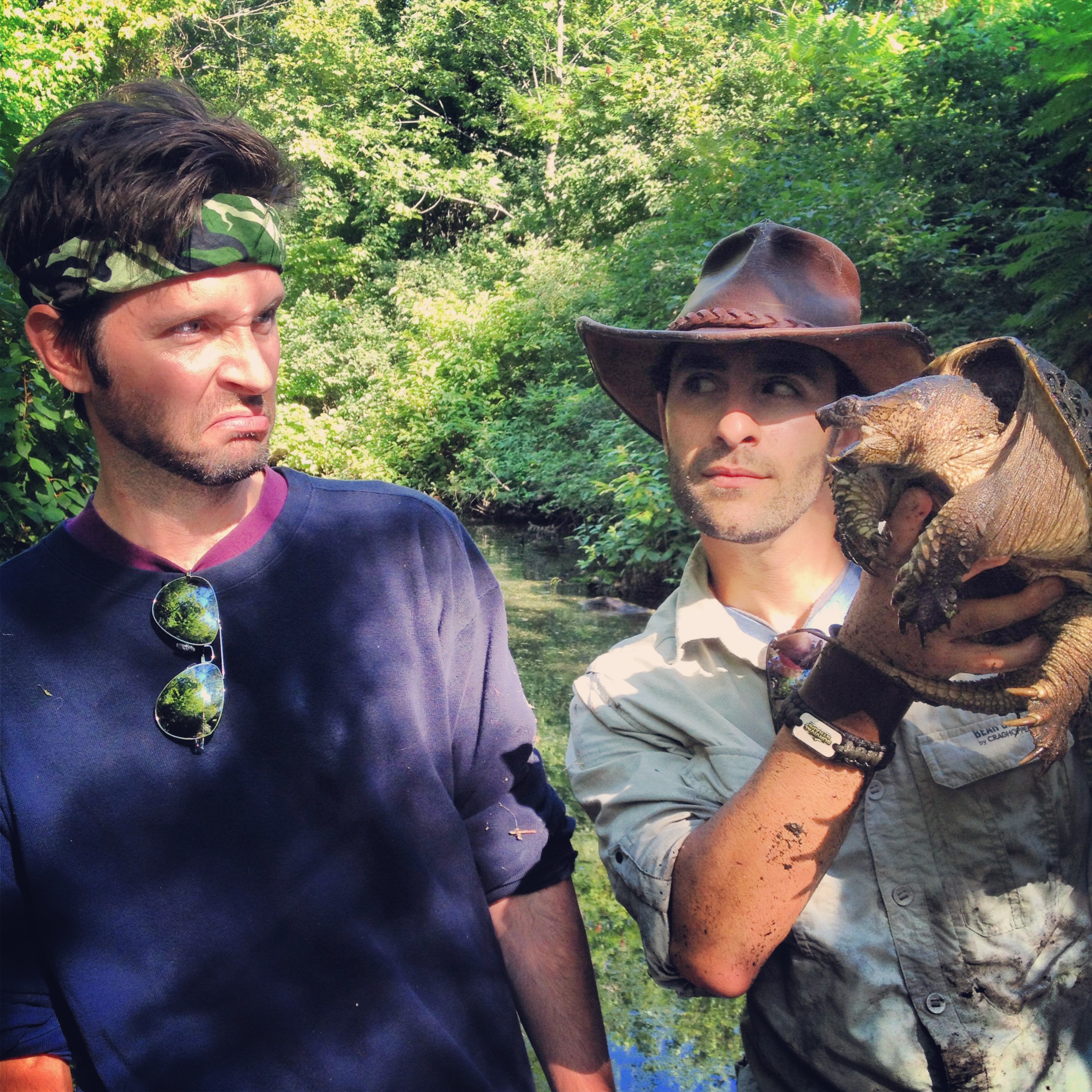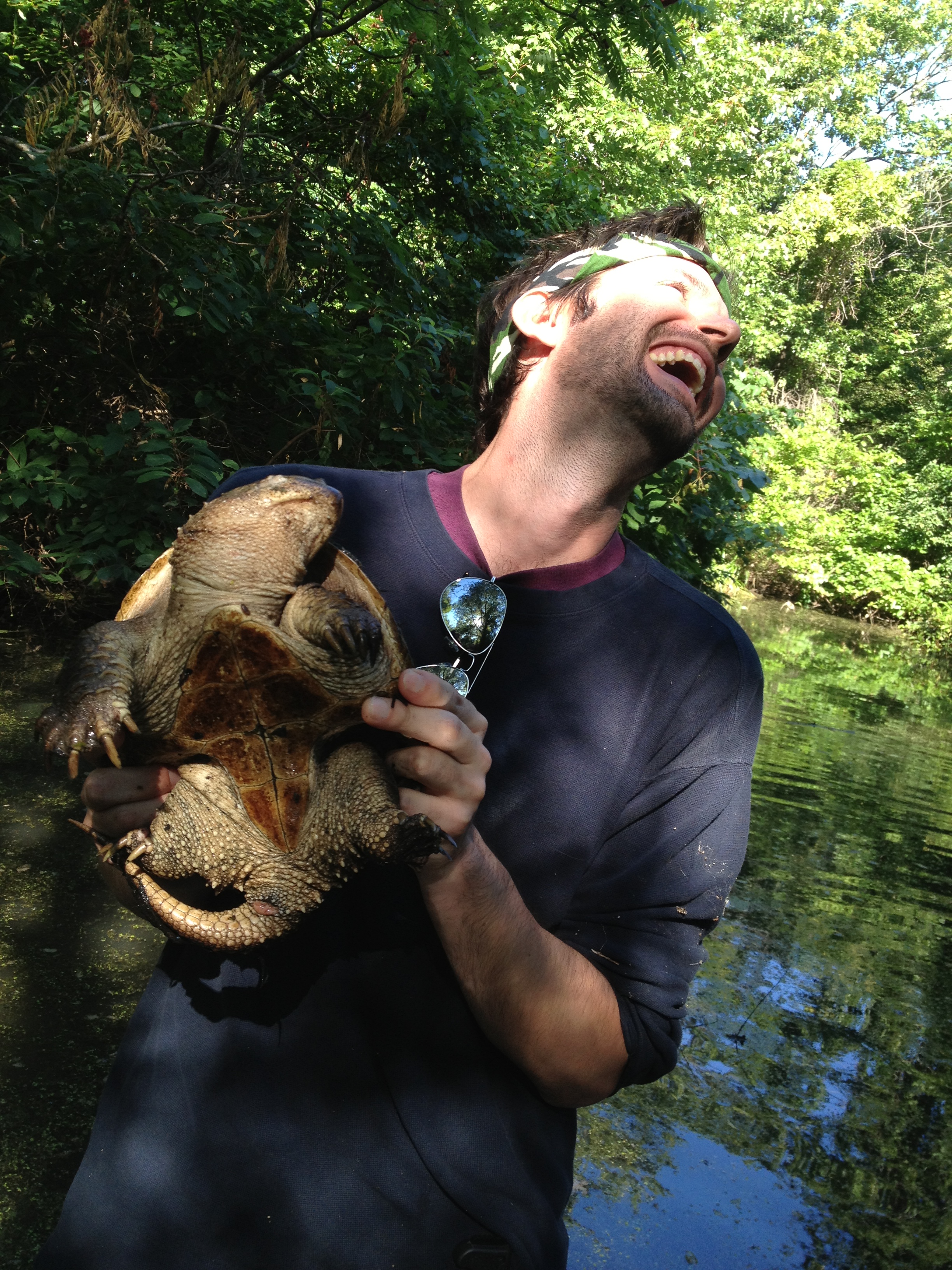 Coyote teaches me about snapping turtle handling, and how to tell if it’s a girl or a boy (girl turtles have bows).