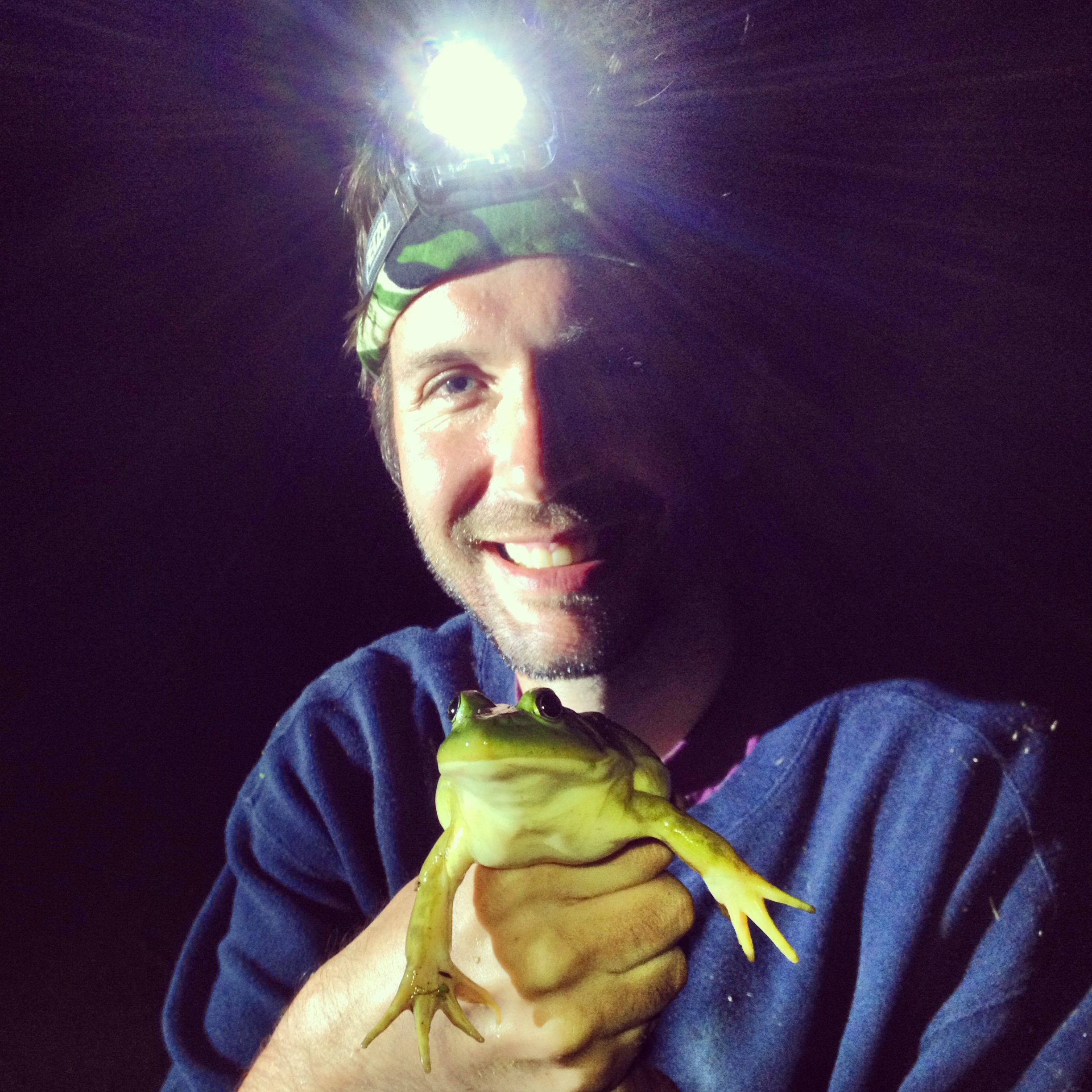 It gets dark and the mosquitos decide to have a Roam About Blood Sucking convention, swarming everywhere, but we push on in the dark, and I try to catch frogs by mesmerizing them with my flashlight. Coyote, batting 1,000, catches yet another animal in the frog below. He let me name it Miss Piggy.