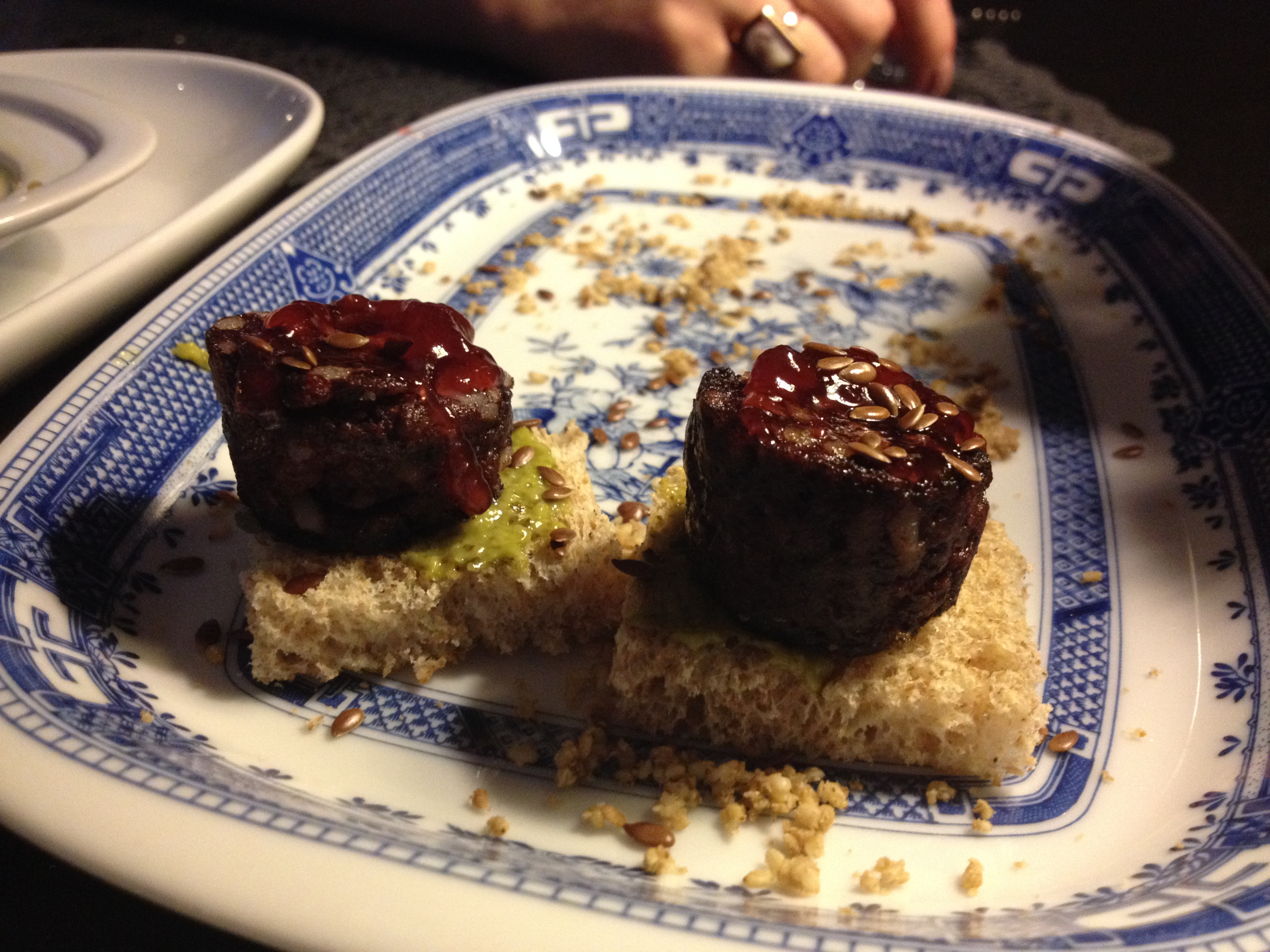 I order a sausage appetizer and out comes one of the greatest things I’ve ever tasted: black (blood) sausage with a dab of pesto, sesame, topped with a tomato marmalade on a toasted bread square.